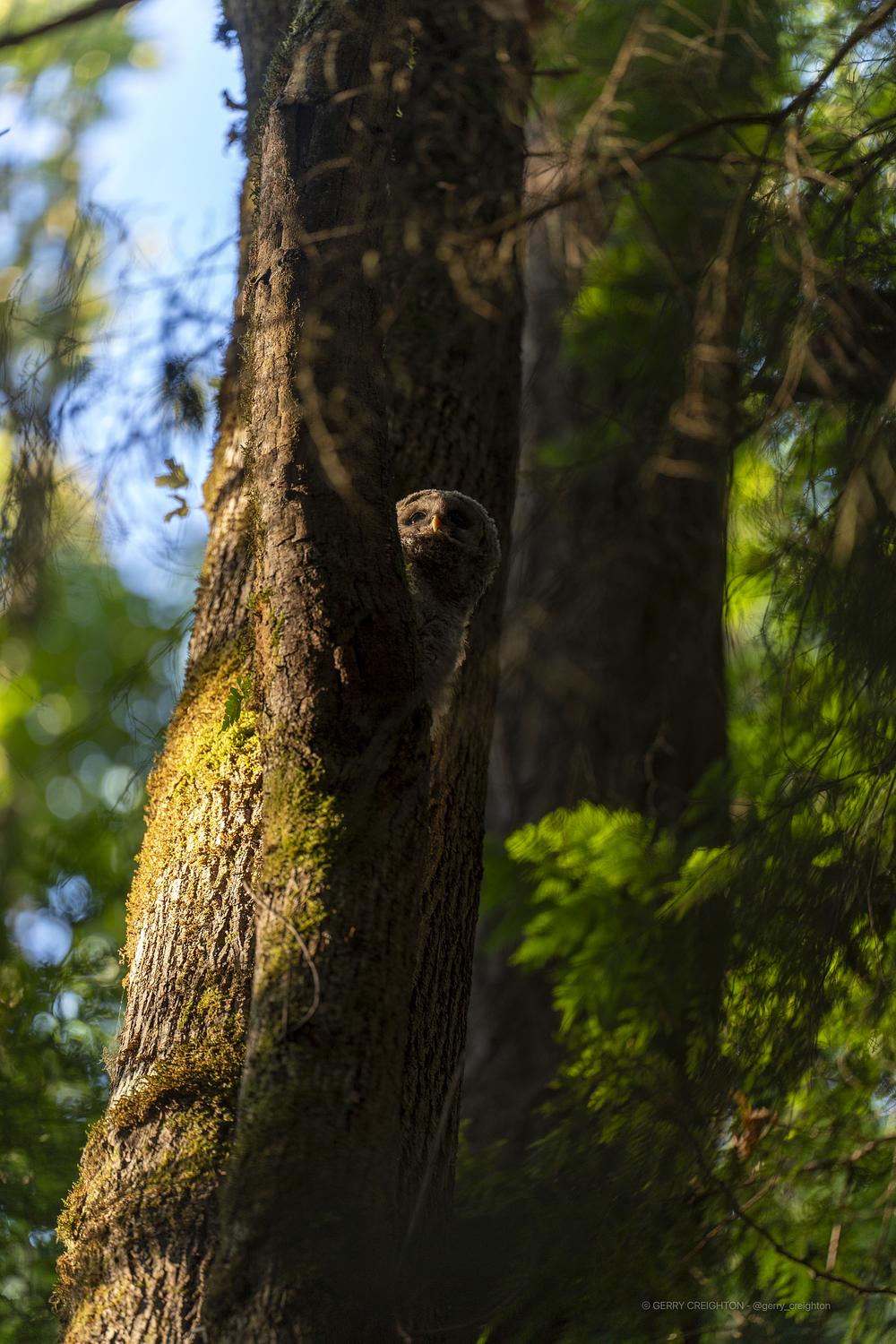 A baby Barred Owl waits for its parents to arrive with food in the evening light.