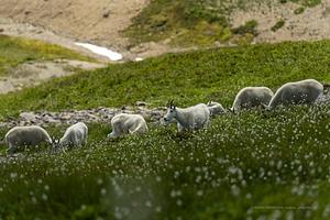 A herd of mountain goats grazing on a slope near Mount Baker, Deming, WA.