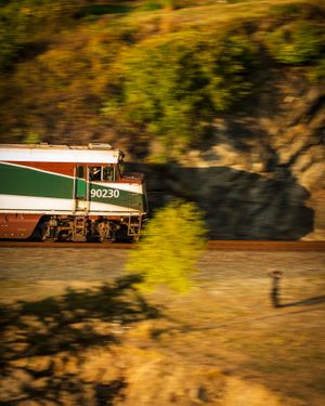 The local Amtrak Cascadia line passes by as a boy waves to the engineer.
